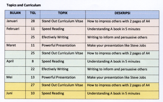 Kegiatan ini khusus bagi civitas FT UGM, tanpa dipungut biaya. Kegiatan periode pertama akan diselenggarakan mulai Januari – Juni 2015. Jadwal kegiatan ini dapat dilihat di http://lib.ft.ugm.ac.id/jadwal-kegiatan/ atau seperti pada gambar di bawah ini.